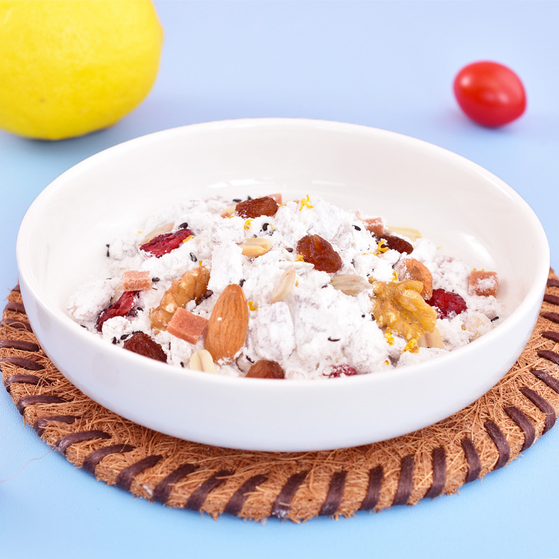 – Bột củ sen, quả sơn trà, nho khô, mè đen, hạnh nhân, óc chó, đường phèn, hạt hướng dương, kỉ tử, táo đỏ, hạt dưa.